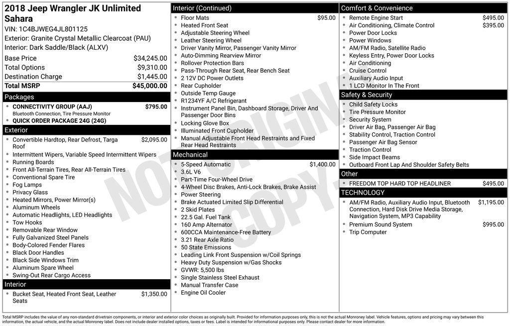 New Price! Certified. Granite Crystal Metallic Clearcoat 2018 Jeep Wrangler JK Unlimited Sahara 4WD 5-Speed Automatic 3.6L V6 24V VVT 18" x 7.5" Polished Satin Carbon Wheels, 6.5" Touchscreen Display, ABS brakes, Alpine 9-Speaker w/All Weather Subwoofer, Brake assist, Connectivity Group, Dual front impact airbags, Electronic Stability Control, Fully automatic headlights, Heated door mirrors, Heated Front Bucket Seats, Low tire pressure warning, Occupant sensing airbag, Outside temperature display, Quick Order Package 24G, Remote Start System, Tire Pressure Monitoring Display, Traction control, Uconnect Voice Command w/Bluetooth, Vehicle Information Center.