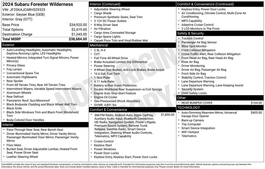New Price! CARFAX One-Owner. Clean CARFAX. Certified. Geyser Blue 2024 Subaru Forester Wilderness AWD Lineartronic CVT 2.5L 4-Cylinder DOHC 16V ***This is a Retired Service Loaner***, 8" Audio w/harman/kardon & Power Rear Gate, ABS brakes, Brake assist, Dual front impact airbags, Dual front side impact airbags, Electronic Stability Control, Exterior Parking Camera Rear, Fully automatic headlights, harman/kardon 9-Speaker Audio System, Heated Front Bucket Seats, Knee airbag, Low tire pressure warning, Occupant sensing airbag, Overhead airbag, Power moonroof: Panoramic, Power Rear Gate, Radio: Subaru STARLINK 8.0" Multimedia Nav System, STARLINK/Apple CarPlay/Android Auto, Traction control, Wheels: 17" x 7.0 J Matte Black Finish Alum-Alloy.