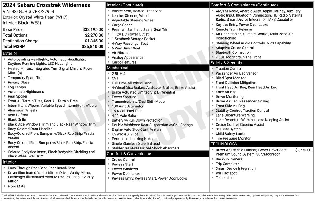 Priced below KBB Fair Purchase Price! CARFAX One-Owner. Clean CARFAX. Certified. Crystal White Pearl 2024 Subaru Crosstrek Wilderness AWD Lineartronic CVT 2.5L 4-Cylinder DOHC 16V 4 New Tires, New Brakes, ***Carfax One Owner***, ***6mo/6k Limited Powertrain Warranty Included***, 10-Way Power Driver's Seat, Auto High-beam Headlights, Exterior Parking Camera Rear, Front dual zone A/C, harman/kardon Aud & Pwr Moonroof & Pwr Driver Seat, harman/kardon Surround Sound Speaker System, Heated door mirrors, Heated Front Bucket Seats, Power Moonroof, STARLINK/Apple CarPlay/Android Auto, Wilderness StarTex Upholstery.