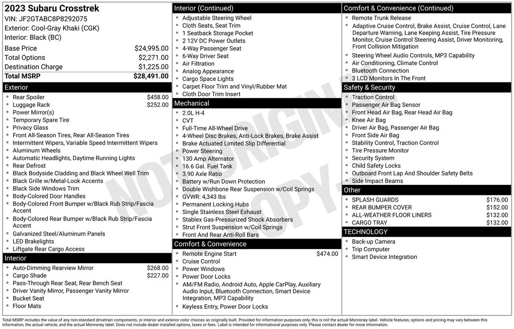 This 2023 Subaru Crosstrek Base is a versatile and capable crossover that's ready to take on your adventures. With its 2.0L 4-cylinder DOHC engine, Lineartronic CVT, and standard Symmetrical All-Wheel Drive, this Crosstrek delivers impressive performance and efficiency, with an EPA-estimated 28 MPG in the city and 33 MPG on the highway. The sleek Gray exterior complements the rugged yet refined styling, while the well-appointed interior offers comfort and convenience features like the Subaru STARLINK infotainment system, EyeSight driver assist technology, and a host of advanced safety features.